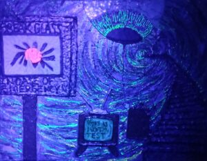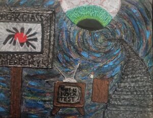 A highly textured surreal painting depicting a contemplative message. A sign to the left says “Break Glass In Case Of Emergency”, the glass on the sign is broken, revealing a red button. To the left a t.v. set says “This Is Just A Test”, with an overturned table and coffee mug floating into a spiraling void. A staircase turns into the heart of the void, as an eyeball sits above it all, watching.